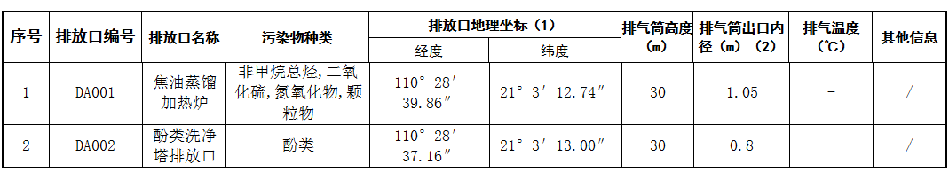 3、排放口数量和分布情况:目前设置两个废气排放口,废水无外排,送至湛江钢铁酚氰废水处理系统后,回用至高炉冲渣。